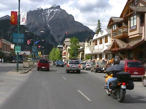 Banff Avenue, downtown Banff and Cascade Mountain.