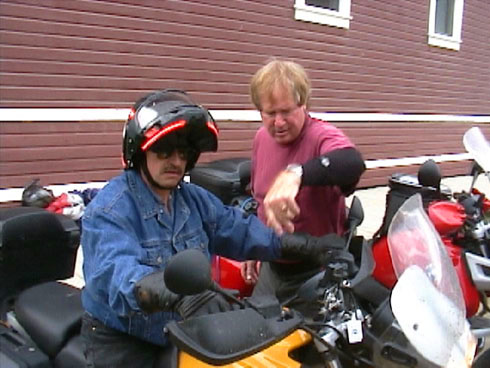 Dick Van Nostrand, owner of the Downtown Hotel, takes Chuck's BMW for a test ride. Dick has a new R1150GS on order.